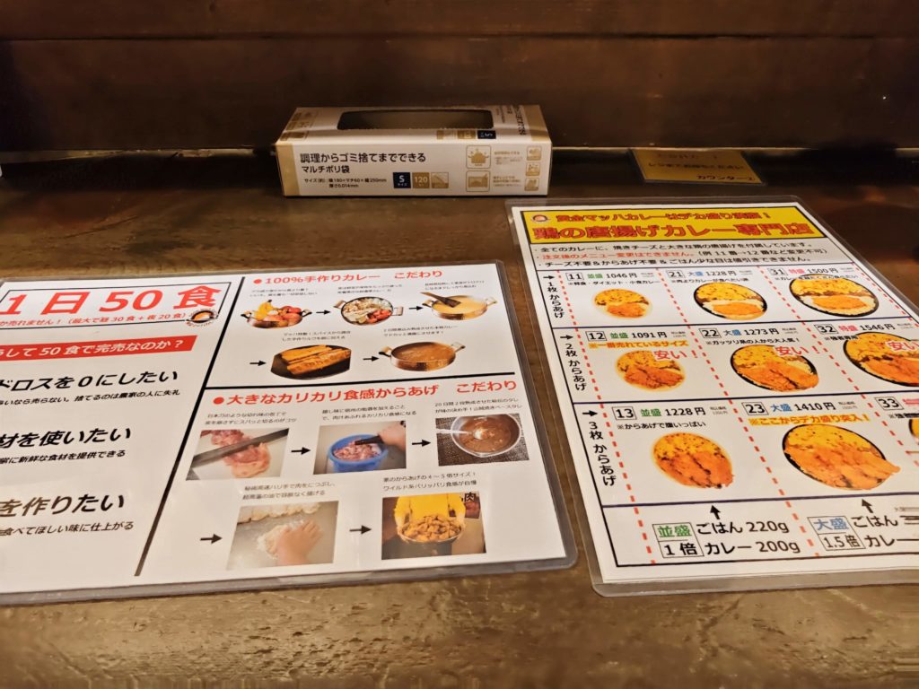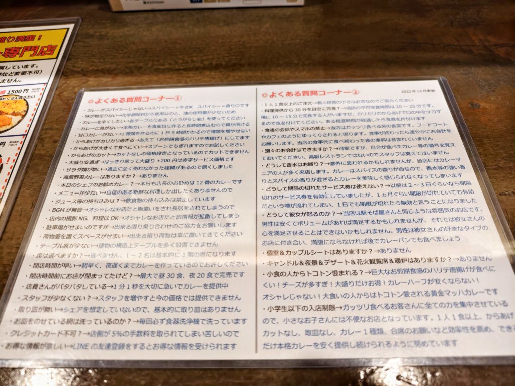 You can be sure to enjoy your meal in peace and quiet. There are many rules written down, and they are so thorough that they are repeated inside the restaurant. However, they are all understandable, so you can concentrate on your curry, especially if you are dining alone. The menu is irresistible for those who love large portions.