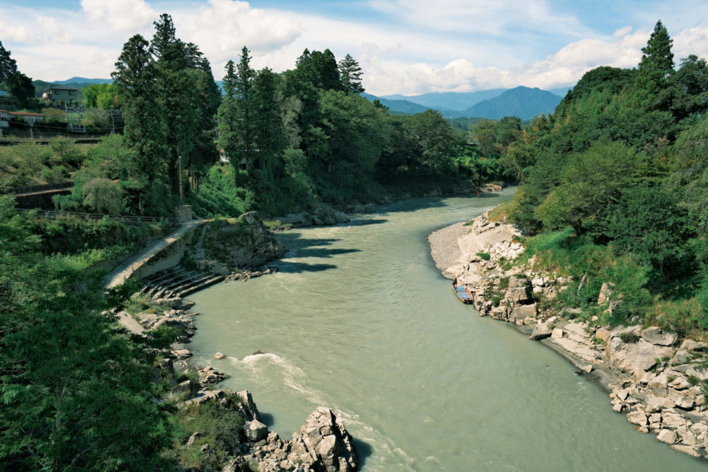 Tenryukyo Gorge, located in Iida City, Nagano Prefecture, is one of Iida City’s most famous tourist destinations. Carved by the erosion of the Tenryu River, the gorge stretches approximately 2km from north to south, and is a beautiful sight in autumn, with beautiful autumn foliage.